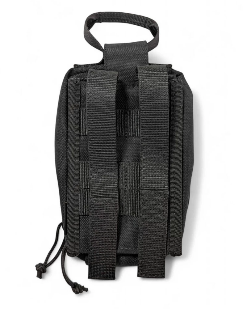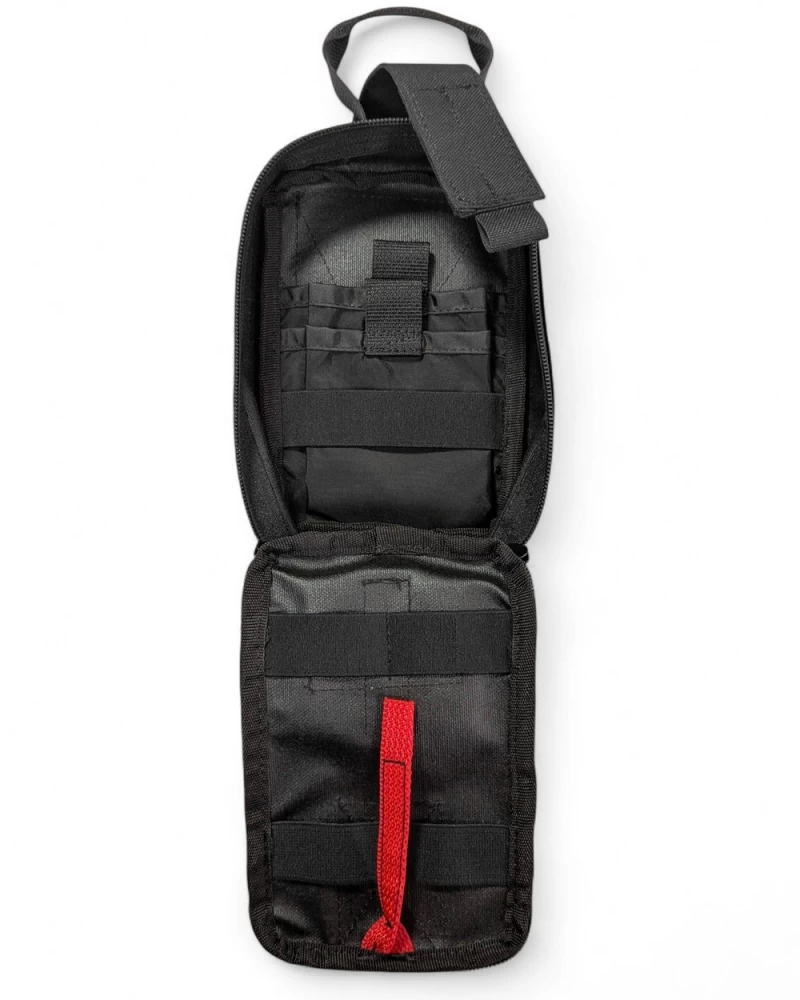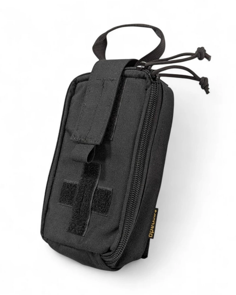 Медицинский подсумок отрывной. Состоит из двух частей: платформы, которая устанавливается на любую систему Молле, и самого подсумка, который крепится к платформе широкой липучкой и дополнительно фиксируется клапаном. Чтобы петля ручки не мешала, ее можно убрать под клапан. На фронтальной стороне есть велкро-панель в виде креста. Если использовать подсумок не для аптечки, а как утилитарный, сюда можно нацепить нашивку. Подсумок закрывается двойной молнией, открывается на 180° и обеспечивает удобный доступ ко всему содержимому. Внутри на одной стороне находятся две эластичные ленты, на другой - два кармана и одна эластичная лента. Материал изготовления - нейлон высокой плотности 1000D, изнутри имеет непромокаемое покрытие. Внизу подсумка есть люверс (отверстие) для отвода влаги или песка. Габариты (без ручки): 19 х 13 х 7 см. Вес: 150 г.
