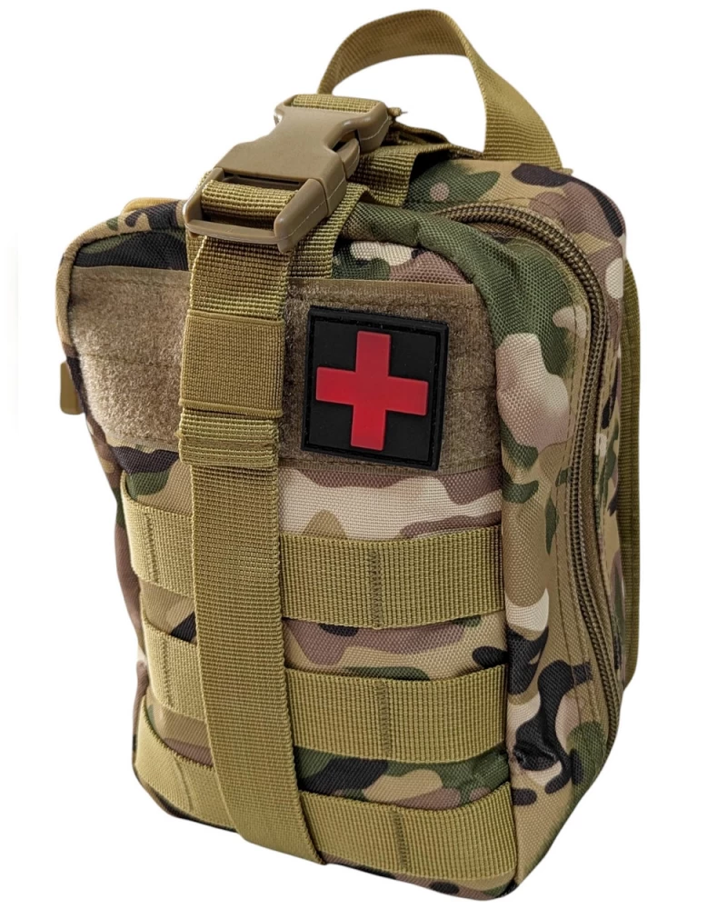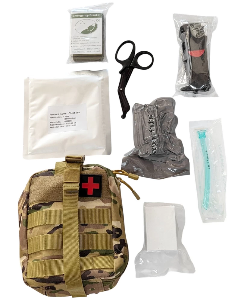 Аптечка тактическая в сборе представляет собой подсумок для размещения необходимого набора медицинских препаратов, перевязочного материала, жгутов и прочих аксессуаров, предназначенных для оказания первой медицинской помощи во время полевых учений и при выполнении боевых задач. Состав: Ножницы медицинские (18,5 см)(черный); Турникет Combat Appliсation Tourniquet (CAT)(алюминиевая вороток); Индивидуальный перевязочный пакет 4" (10 см); Бинт-тампонада в вакуумной упаковке; Подсумок для аптечки съемный molle (Multicam). Окклюзионный пластырь Chest Seal Y-образный (вентилируемый) Покрывало спасательное (160х210 см) Назофарингеальный воздуховод (7.0 мм)