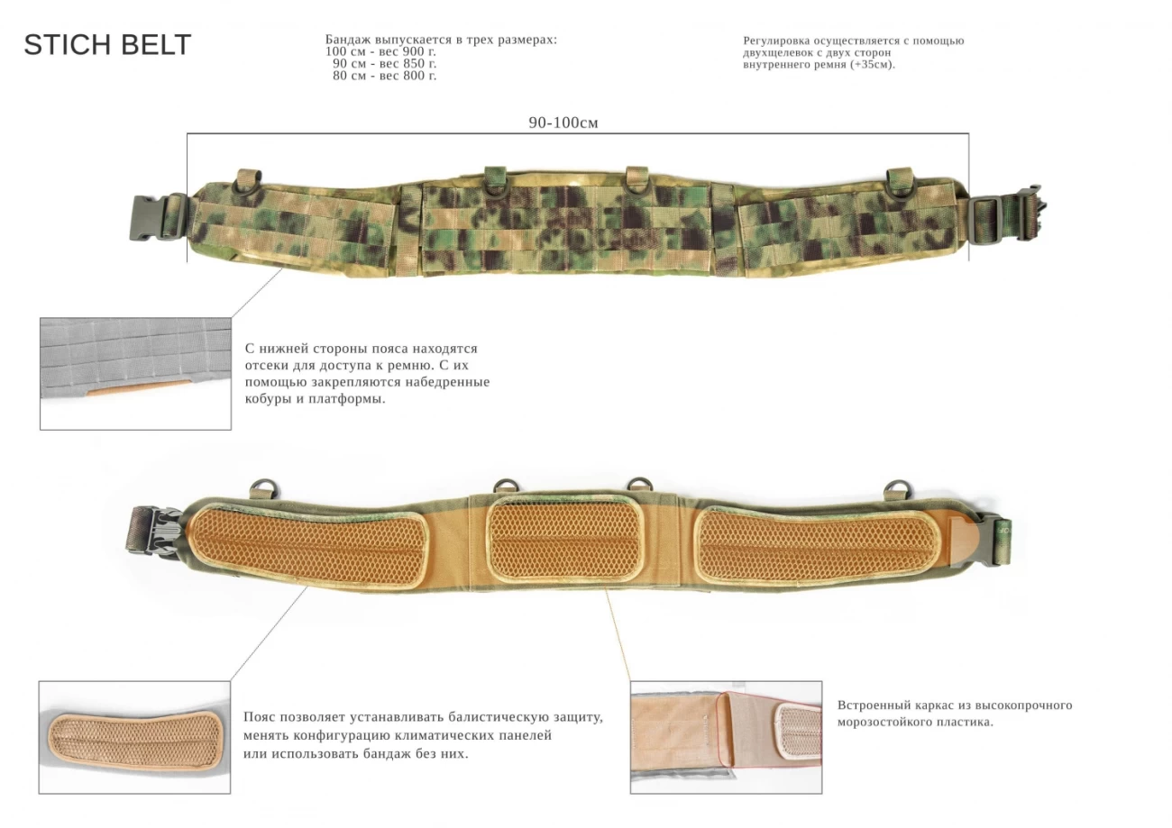 Разгрузочный пояс предназначенный для размещения снаряжения. Армирован пластиковыми вставками для жесткости при поперечной нагрузке. Имеет петли для крепления поясных лямок. Пояс может быть укомплектован противоосколочным экраном. Характеристики: Материал: нейлон плотностью 1000D, или нейлон плотностью 500D с ИК ремиссией, и вариант в оригинальной ткани Cordura с расцветкой MultiCam и ИК - ремиссией.Фурнитура: WJ, DuraflexВес: 820 гр Размерная сетка пояса Бандаж выпускается в трех размерах: 100 см (на талию 110 - 130 см). Длина полезной площади бандажа: 100 см (10 ячеек в центре, 7 по бокам) (дальнейшая регулировка с помощью внутреннего ремня-стропы до 130 см). - вес 900 г. 90 см (на талию 100 - 120 см). Длина полезной площади бандажа: 90 см (8 ячеек в центре, 6 по бокам) (дальнейшая регулировка с помощью внутреннего ремня-стропы до 120 см). - вес 850 г. 80 см (на талию 90 - 110 см). Длина полезной площади бандажа: 80 см (6 ячеек в центре, 5 по бокам) (дальнейшая регулировка с помощью внутреннего ремня стропы до 110см). - вес 800 г.