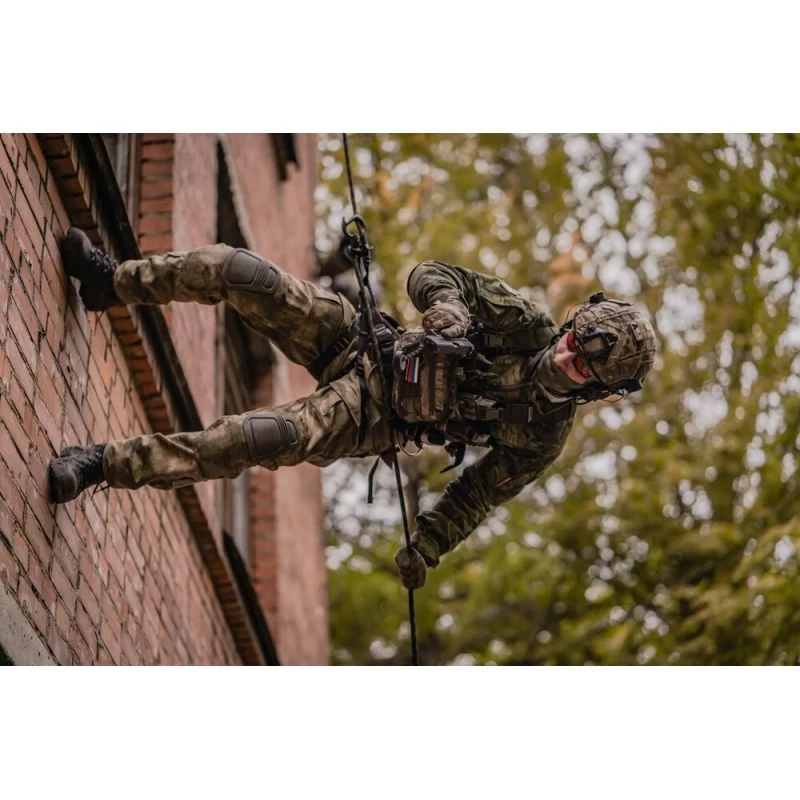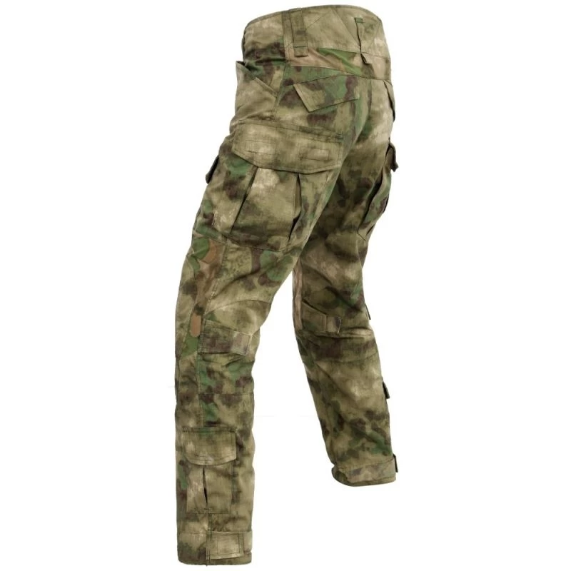 Особенности: Брюки, зауженные к низу с широким поясом и шлевками для ремня Карманы: два боковых, два боковых набедренных объемных с клапанами, два прорезных задних с клапанами, два передних накладных набедренных, два боковых накладных внизу брюк с клапанами. Усиления расположены в области колен со съемными вставками (приобретаются отдельно), высоту колена можно изменять при помощи стяжки внутри бокового верхнего кармана. Объем под коленом сзади и по низу брюк регулируется при помощи пат с текстильной застежкой. Кокетка на задних половинках брюк и в области колена спереди из эластичной ткани.