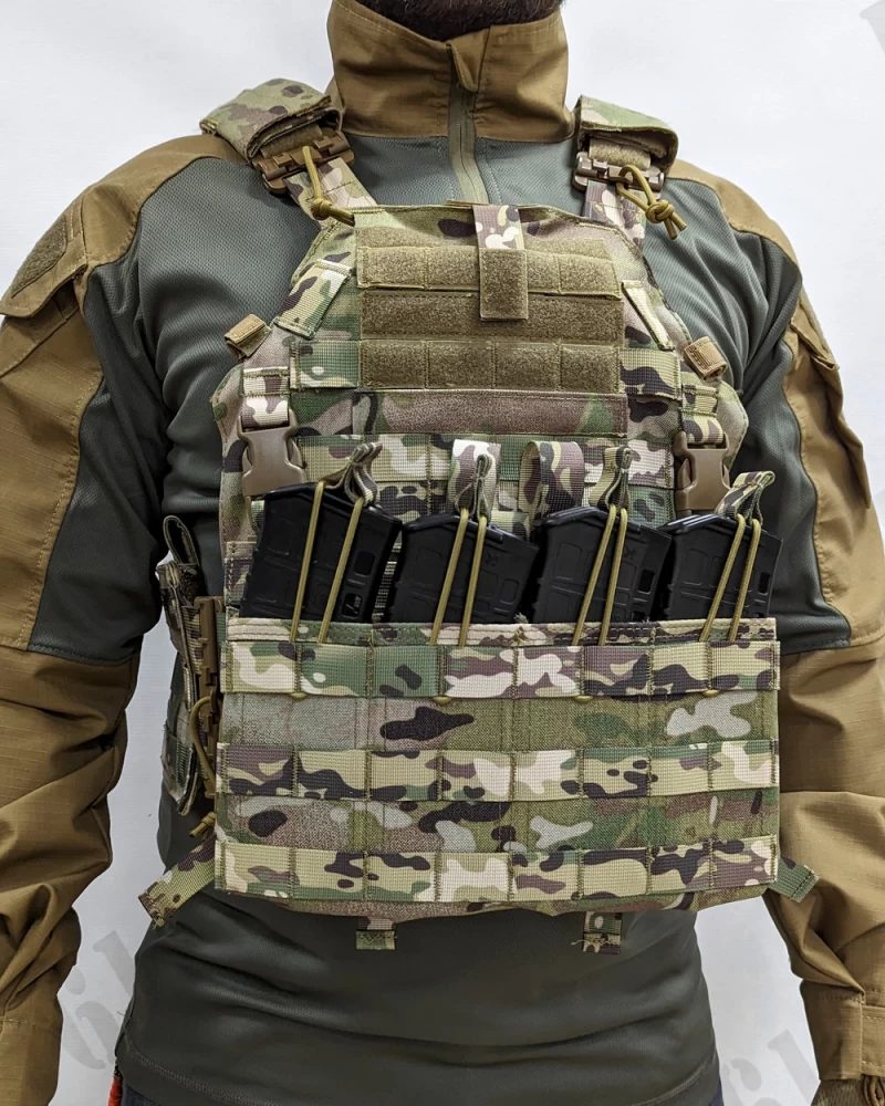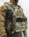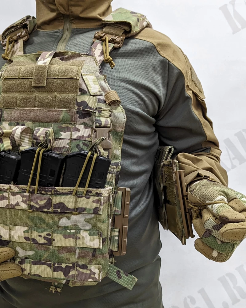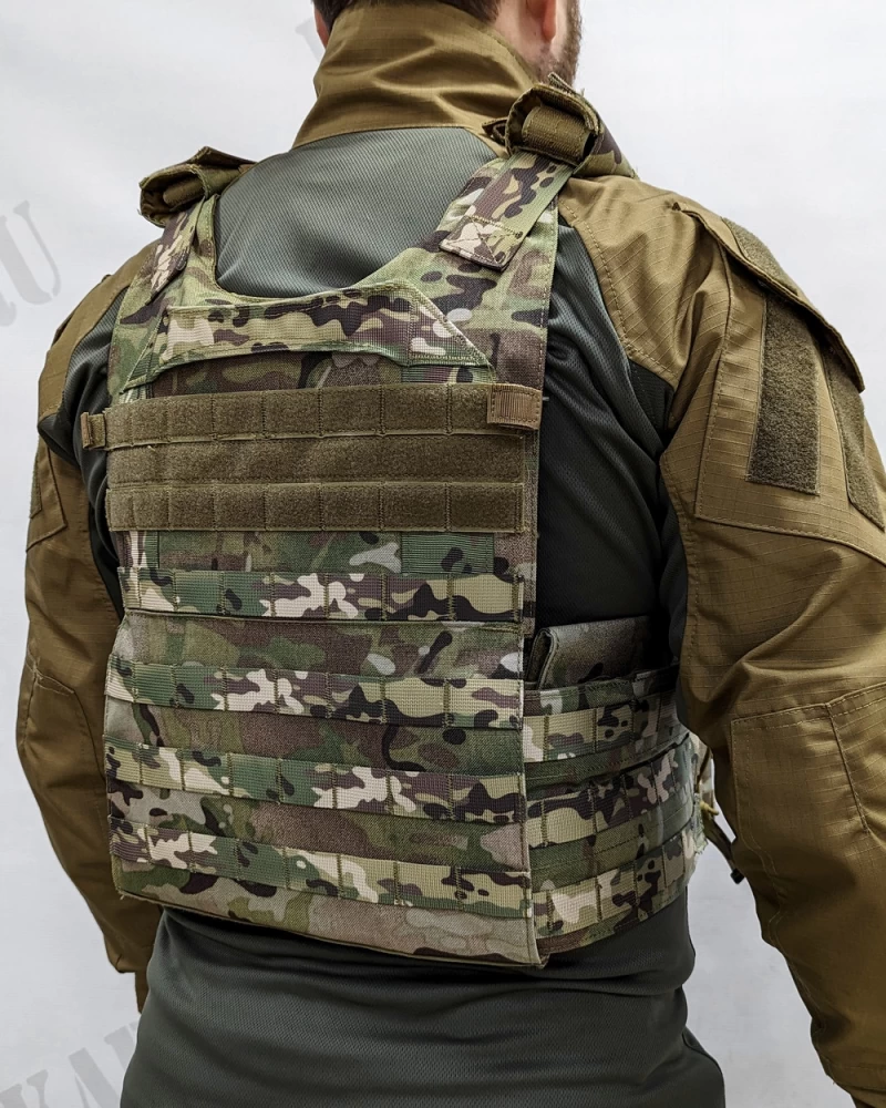 Предназначен для ношения бронеплит типа Гранит, SAPI и арамидных экранов. • Имеет систему быстрого сброса на плечах и камербандах • Чехол состоит из передней и задней панели для размещения бронеплит и противорикошетных пакетов. Регулирующихся по длине плечевых лямок со съёмными мягкими прямоугольными подкладками – демпферами. А также боковых поясных обхватов с отсеками для размещения бронепластин и мягкой противоосколочной защиты.• Габариты жилета подобраны таким образом, чтобы с одной стороны он не сковывал движения военнослужащего и обеспечивал необходимую вентиляцию, а с другой стороны обеспечивал защиту наиболее жизненно важных органов. Это становится особенно актуально в условиях повышенной температуры и влажности.• На передней панели в районе груди есть ячейки molle для крепления дополнительного снаряжения. Поверх ячеек нашита липучка для размещения патчей и неймтапов.• Для фиксации мундштука от питьевой системы, в верхней части передней панели пришит ремень с липучкой.• По бокам основного отсека пришиты шлёвки для крепления PTT, либо тангенты от радиостанции.• Впереди внизу фронтальной панели нашита мягкая часть липы для крепления съёмных модулей. В стандартной комплектации идёт модуль с 4 подсумками под магазины в ширину.• На спине расположены: эвакуационная петля, Molle ячейки для фиксации продовольственной сумки, чехла под гидросистему или штурмового рюкзака, а также клапан дающий доступ к системе регулировки длины камербандов. Верхние три ряда ячеек покрытых липучкой для установки опознавательных знаков.• Камербанды обшиты Molle ячейками для размещения боекомплекта, аптечки и прочего снаряжения. Во внутренние карманы устанавливаются бронеплиты и противоосколочные пакеты.• Камербанд фиксируется с помощью липучки на передней панели. Для удобства надевания и сброса чехла, в передней его части пришиваются две вертикальные ручки - петли из ременной ленты.• Плечевые лямки имеют возможность регулировки по длине с помощью системы с липучкой и двухщелёвкой. По бокам на них имеются прорези для установки защиты плеч.• На внутренней части передней и задней панели, а также на камербанде есть липучка для крепления климатических амортизационных подпоров. КАП в комплект не входят!