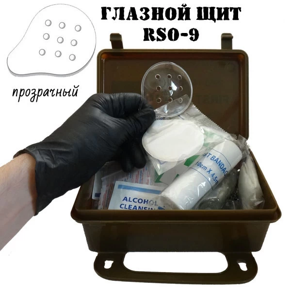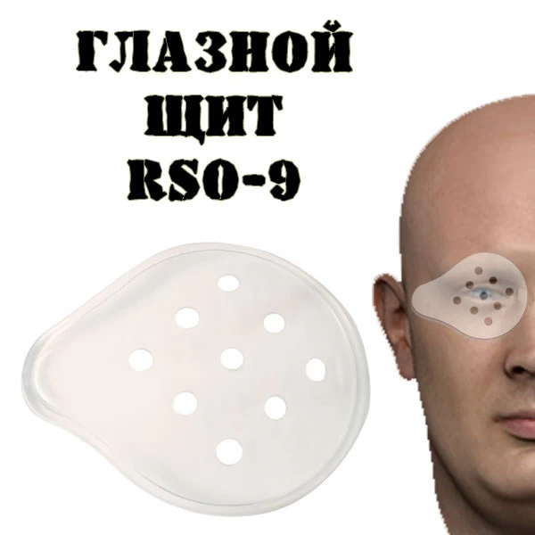 Глазной щит RSO-9 – это специальный пластиковый экран для защиты глаза и окружающих его мягких тканей. Это средство первой помощи при проникающих травмах глаз или глазниц. Его используют чтобы защитить поврежденное место от случайных касаний, трения и ударов. Он имеет специальную выпуклую форму, под которую можно положить ватно-марлевую повязку, кусок бинта или вложить обратно разорванные мягкие ткани. В случае необходимости, щит для защиты глаз RSO-9 можно использовать при перевязке ран в качестве аппликатора давления. Просто положите его при намотке очередного слоя бинта поверх раны и прижмите покрепче: выпуклая форма глазного щита создаст точечное давление, помогая остановить кровотечения и сжать края раны. Особенности: - Универсальный размер, одинаково подходит для людей любой конституции - Защищает не только сам глаз, но и окружающие его мягкие ткани - Имеет удобный выступ для удержания при фиксации - Перфорированный и вентилируемый с 3х3 = 9 каналами для выхода воздуха. Форма RSO-9 позволяет фиксировать его несколькими способами. Базовый - пере(при)матывая обычным марлевым бинтом. Альтернативный - пластырем крест-накрест. Запасной - на резинку или веревку. Благодаря отверстиям, предусмотренным в корпусе глазного щита, его можно крепить на шнур или тесемку, одевая вокруг головы. Материал: ударопрочный пластик Количество отверстий: 9