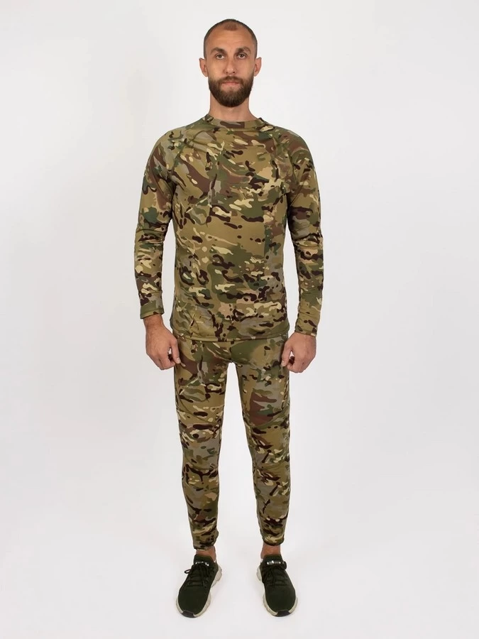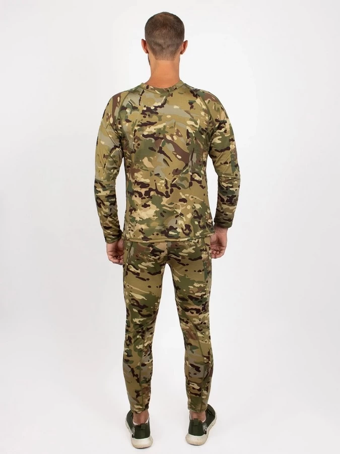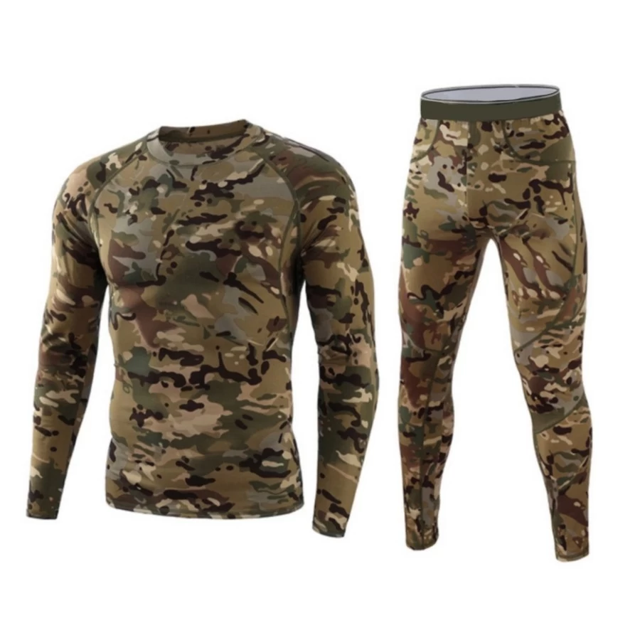 Термобелье мужское камуляжное тактическое. Высокоэластичное дышащее мужское зимнее нижнее белье. Состав комплекта: лонгслив и брюки на резинке. Карманов нет. Материал: Верхний слой - 90% полиэстер, 10% спандекс. Подкладка - Флис (100% полиэстер). Особенности: Отлично сохраняет тепло. Дышащая ткань позволяет меньше потеть, что особенно важно в зимний период. Благодаря анатомическому крою плоские швы не натирают кожу.