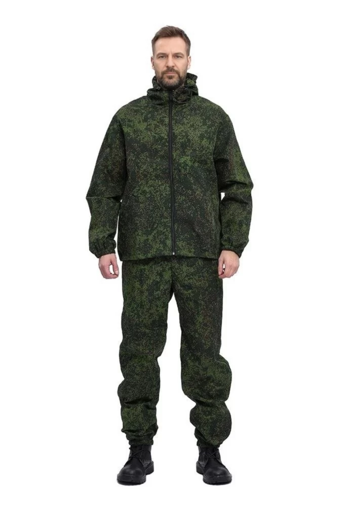 Костюм используется в качестве маскировочного костюма, состоящего из куртки и брюк.Куртка- центральная бортовая застежка на молнию- нижние фигурные накладные карманы с наклонным входом- спинка прямая, цельнокроеная- рукава прямые, низ собран с помощью эластичной резинки- по низу куртки расположена кулиса- капюшон втачной с кулисой по лицевому срезуБрюки:- прямые на поясе, собранном фиксированной эластичной резинкой- в верхней части расположены карманы, с отрезным бочком- низ брюк собран фиксированной эластичной резинкой Материал: сорочечная ткань (65% полиэфир, 35% хлопок), плотность 120 г/м2