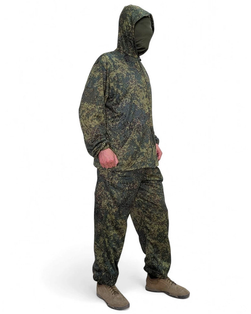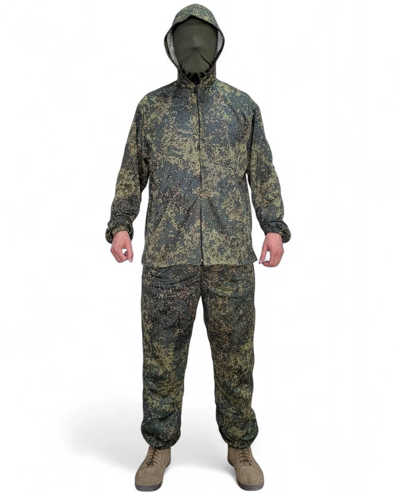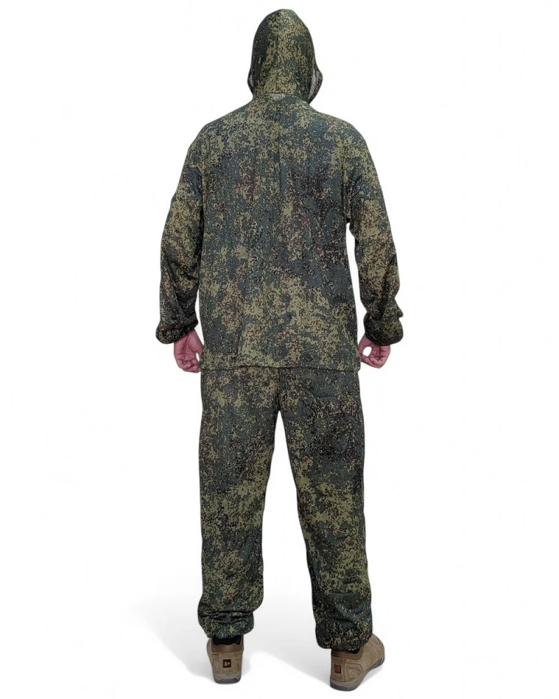 Костюм маскировочный "Сетка" - максимально легкий, свободного покроя костюм, который гарантирует свободу движений, обладает высокой воздухонепроницаемостью и устойчив к проникновению УФ-лучей за счет сетчатой фактуры ткани. Подходит для лесной местности как в военных, так и тактических целях (рыбалка, охота, наблюдение за птицами и животными в их привычной среде обитания). В костюме комфортно в жаркую погоду, а также его можно надевать поверх одежды в качестве защитного слоя. Характеристики: Куртка - укороченная, с центральной бортовой застёжкой на молнию и с капюшоном. На куртке имеется 2 передних внутренних наклонных кармана. Внизу рукавов расположены эластичные стяжки (резинки). Брюки: Брюки свободного кроя, не стесняют движения. Пояс на резинке с дополнительной утяжкой шнуром. На брюках имеются 2 боковых врезных кармана. Низ брюк на резинке. Материал: Основная ткань — 100% полиэстер.