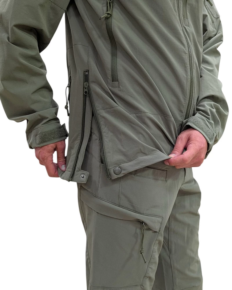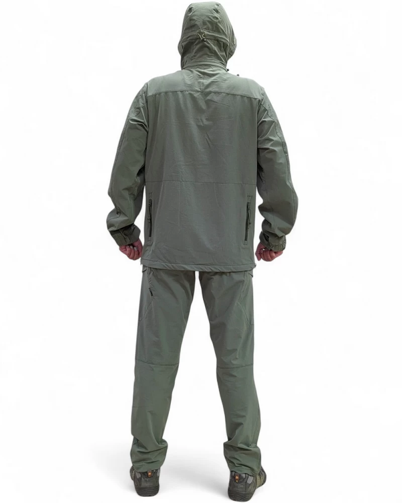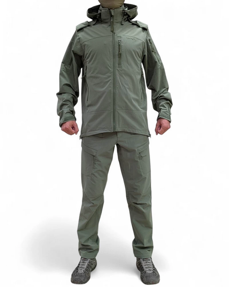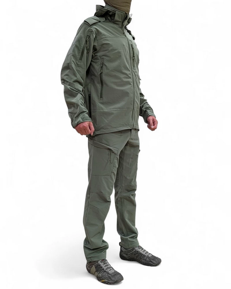 Костюм тактический демисезонный состоит из куртки и брюк: Куртка классической длины с воротником-стойкой и съемным капюшоном. Регулируемый эластичный шнур и фиксатор на задней части капюшона. Три кармана спереди на молнии. Задний сквозной карман на молнии. На рукавах имеются небольшие карманы на молнии и велкро-панели для патчей. Регулируемые манжеты на липучках. Имеются крепления для фальш погон. Также куртка оснащена системой обеспечивающей легкий доступ к пистолету или любому другому оборудованию, закрепленному на поясе. Брюки эргономичного кроя с боковыми карманами и объемными накладными карманами с клапанами. Классическая застежка-гульфик на молнии и пуговице. Низ брюк регулируется по объему эластичным шнуром и фиксатором. Преимущества костюма:- Надежная защита от ветра и повышенные водоотталкивающие свойства за счет состава ткани- Быстро сохнет- Отличный воздухообмен, высокая паропроницаемость при нагрузках- Легкий, компактный и эластичный Состав: ткань SoftShell: Нейлон 91%, спандекс 9%