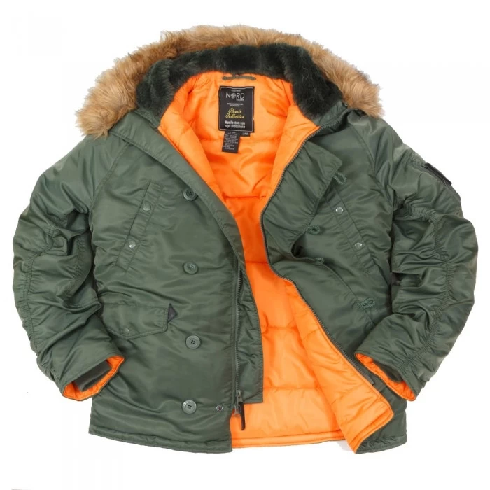 Куртка Аляска N-3B была разработана для летных экипажей, работавших в экстремальных условиях и на больших высотах, где температура воздуха доходит до -35°C. Она была проверена пилотами вертолетов и стратегической бомбардировочной авиации. Поэтому эта куртка выдержит испытание экстремально холодных погодных условий. Материал куртки - 100% нейлон с водооталкивающей пропиткой от DuPont, грязезащитная и маслооталкивающая пропитка. На рукавах в районе локтя укрепляющие заплаты. Утяжка в районе пояса. Два кармана в верху внутренние, нижние накладные. На рукаве карман для сигарет и ручек. Подкладка – полиэстерное волокно. Капюшон оснащен искуственным мехом и оторочен отсегивающимся мехом. Характеристики:• 100% нейлон,• водооталкивающая пропитка,• четыре кармана• манжеты трикотаж,• утеплитель – полиэстерное волокно,• капюшон с искусственным мехом,• затяжка на талии. Цвет: олива/ оранжевая подклада