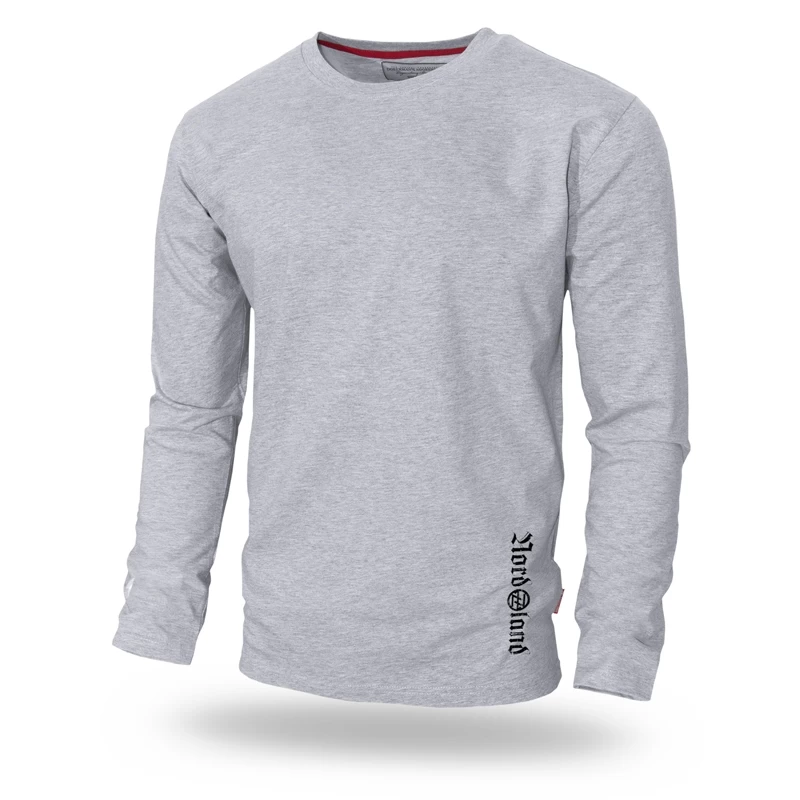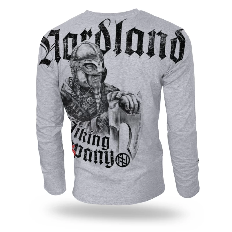 Лонгслив изготовленный из чистого хлопка плотностью 200 г. Стандартный мужской фасон с прямым рукавом и горловиной обработанной трикотажной резинкой. С изнаночной стороны красная кайма. На передней стороне небольшая надпись Nordland, расположена вдоль левого шва и повторяется на лопатках размером побольше. По середине спины больших размеров картинка - узор с изображением викинга, дугообразная надпись Viking Company со щитом и руническими символами. Дополнительно на изделии размещено число 793 контрастного цвета. Скандинавский стиль.