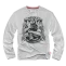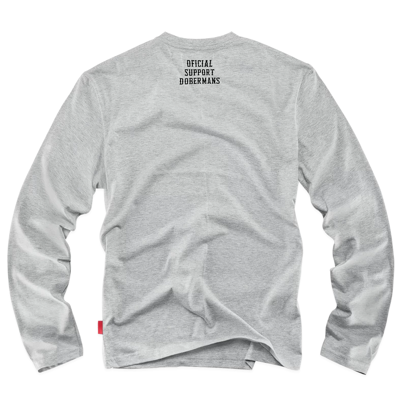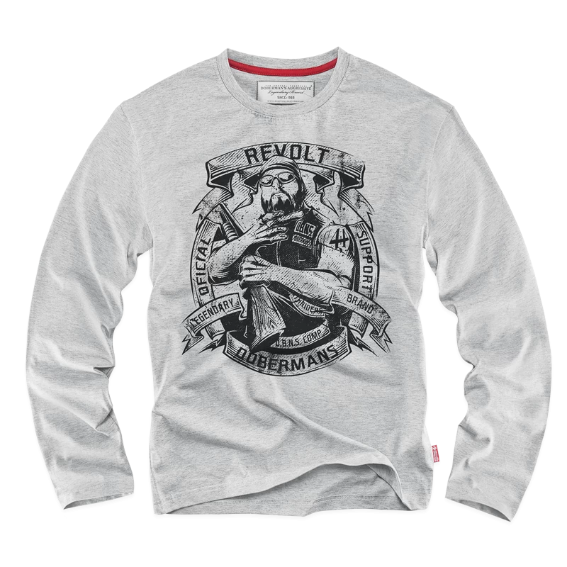 Хлопчатобумажная футболка типа лонгслив. Стандартный мужской крой, длинный прямой рукав и прочная трикотажная резинка у горловины. Модель изготовлена из качественной хлопчатобумажной ткани плотностью 200 г. На передней стороне графика с текстом вписанным в ленты: Revolt, Oficial Support Dobermans, Legendary Brand. В центре узора силуэт байкера с татуировкой в виде числа 44 на плече. Принт с заметным эффектом краккле, одноцветный, покрывающий почти все изделие. Спина декорирована небольшой надписью, расположенной на уровне шеи.