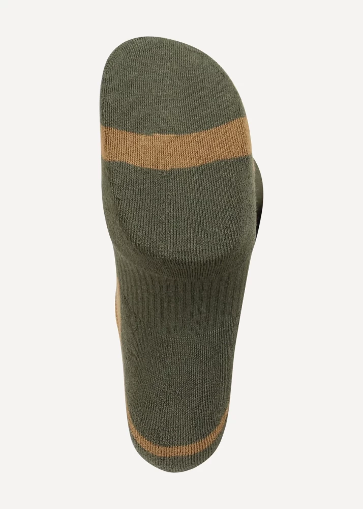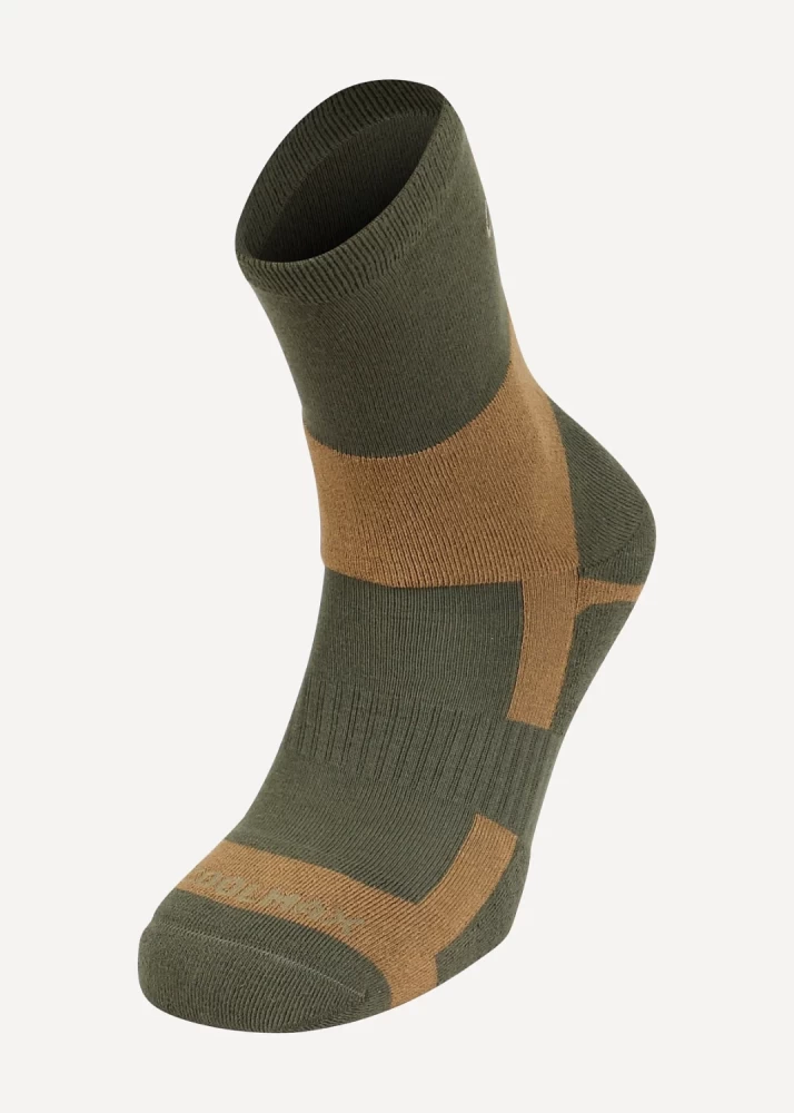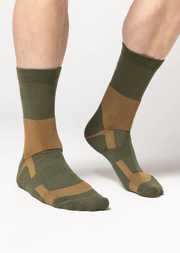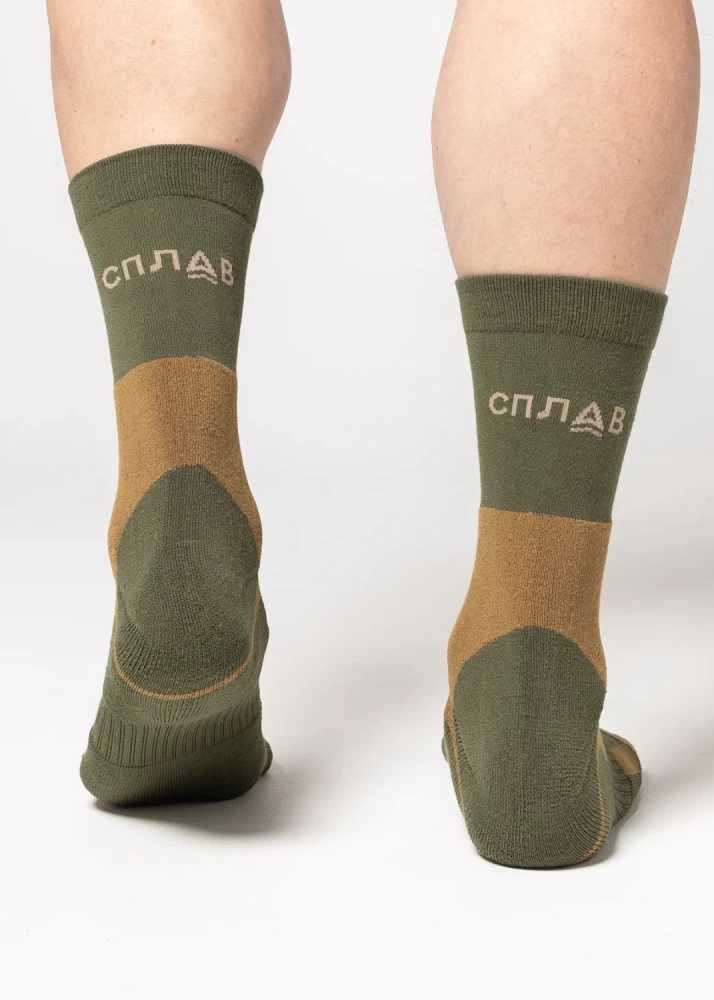 Бесшовные всепогодные трекинговые носки с большим содержанием волокон Coolmax®, адаптированные для использования с тактической обувью. Нитки, немного вылезающие наружу на стыке зон различного плетения и цвета, являются технологической особенностью, не влияющей на прочность и функционал носка. Это происходит при начальной носке и первой стирке, далее процесс купируется. При этом ничего в данных областях не расходится, носки долго не теряют потребительских свойств (при условии соблюдения рекомендаций символов по уходу). Для гарантии износостойкости носка не рекомендуем обрезать данные нитки. Особенности В производстве носков компании Сплав сочетаются новейшие технологии производства, собственные лабораторные исследования, современный дизайн и тестирование продукции в реальных условиях. Мы уделяем внимание каждой детали, проверяя устойчивость материала к интенсивному износу, механическим и химическим воздействиям. Характеристики Расцветка является сочетанием двух распространенных защитных цветов (олива и койот) Отсутствуют лишние декоративные детали Оптимальная длина под ботинки с высоким берцем Бесшовная технология создает повышенный комфорт, предотвращая натирание пальцев ног Наличие усиленных зон с нейлоном в области пальцев, пятки и подошвы обеспечивает повышенную износостойкость Зона с содержанием эластичного материала не позволяет носку сползать и собираться в складки Зоны с мягкими петлями на пальцах, подошве, пятке и лодыжке защищают ногу от натирания при длительном ношении с грубой обувью Волокно Coolmax® избавит от влаги и не даст ногам замерзнуть или перегреться Материал: 80% Сoolmax® 17% nylon 3% elastane Свойства Coolmax®: Coolmax® — полиэстеровое волокно фирмы DuPont®, с четырехжильной нитью Эффективно отводит влагу с поверхности тела Сохраняет тело сухим даже во время больших физических нагрузок