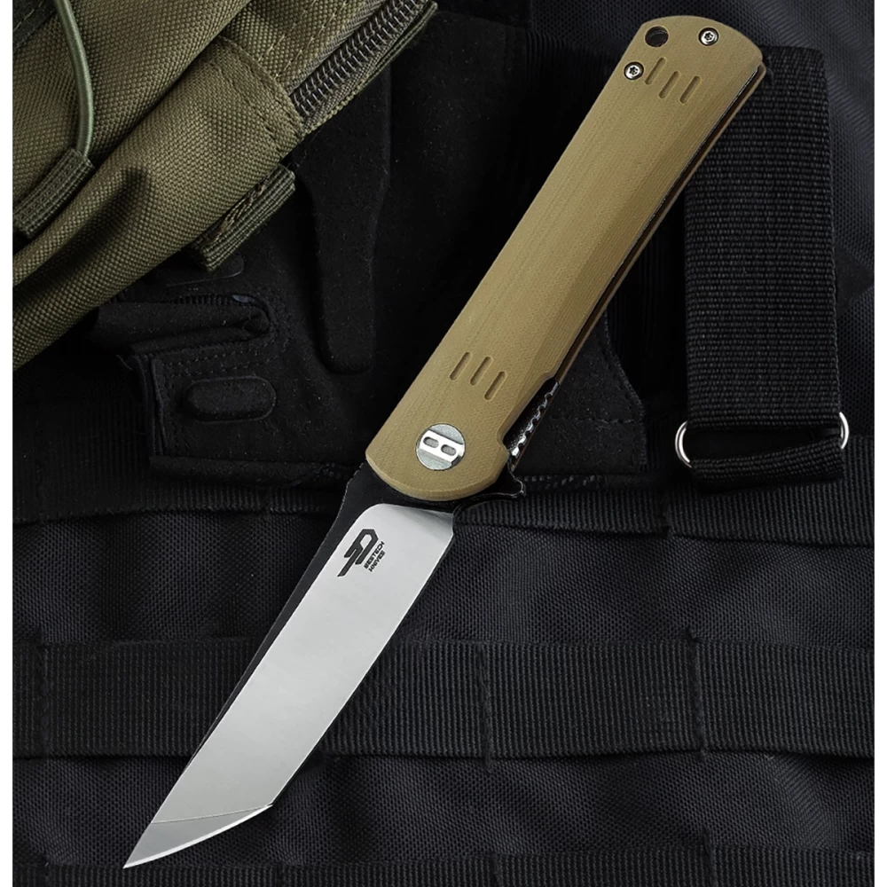 Kendo - семейство флипперов от компании Bestech Knives. Эта модель имеет красивейший профиль японское танто, который отличается более закруглённой формой ближе к острию по сравнению с агрессивным острым углом схождения режущих кромок «Амертанто». Таким клинком резать на доске намного сподручнее. Высокие спуски гарантируют бритвенный рез; есть небольшая дулька, облегчающая процесс заточки. Выполнен клинок в инструментальной стали D2. Это «полунержавейка» с содержанием хрома недостаточным, чтобы считаться полноценной коррозионно-стойкой сталью (необходим минимальный уход). Зато благодаря высокому содержанию углерода она прекрасно режет, имеет высокую твёрдость/вязкость и удерживает заточку даже после серьезных нагрузок. Финиш клинка комбинированный — черное покрытие/satin, и выглядит это очень эффектно. Нож открывается за плавник, что увеличивает полезную длину клинка (шпеньков нет). Когда нож раскрыт, плавник становится своеобразной мини-гардой. Осевой узел выполнен на подшипниках с керамическими шариками — механика прекрасная, клинок просто «летает». Замок — классический Liner Lock, проверенный временем и интуитивно понятный. У ножа лайнеры закрыты накладками из стеклотекстолита G-10 — популярнейшего композита, используемого во всём мире для изготовления прочных и ударостойких рукоятей. За вменяемые деньги вы получите одного из лучших EDC-шников, специалиста по разрешению ситуаций с клинком из проверенной стали и лаконичным дизайном.