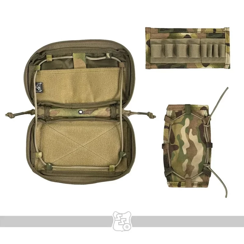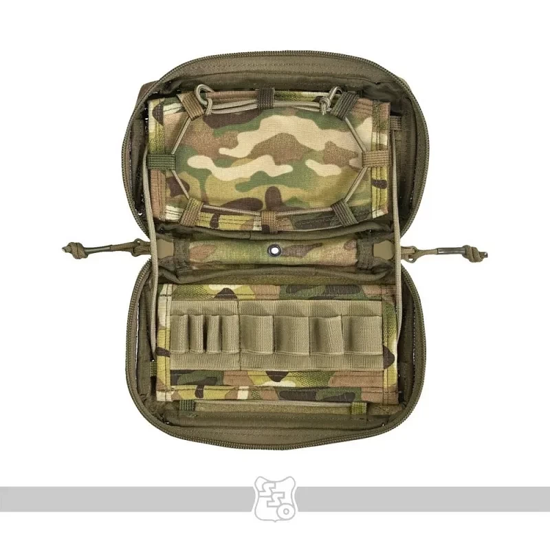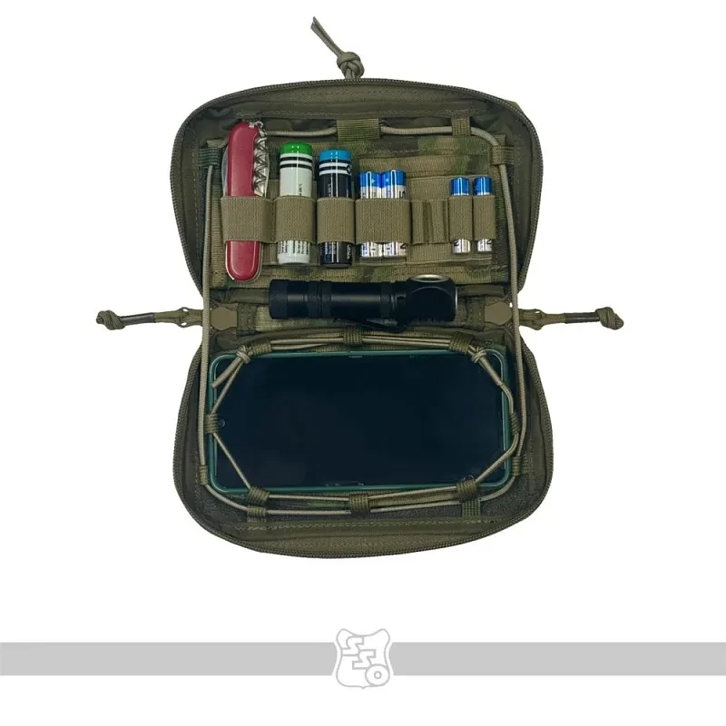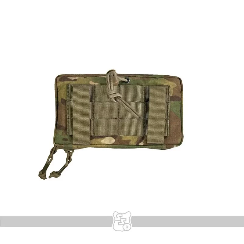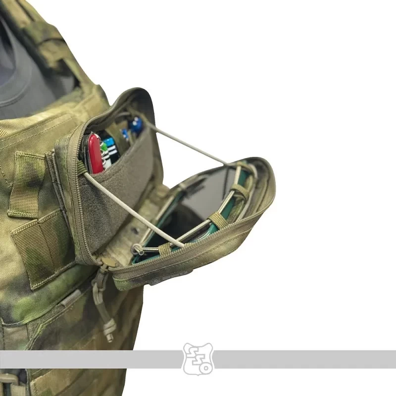 Административный подсумок " Вектор" был разработан учетом пожеланий и опыта участников СВО.Подсумок имеет размеры 20х11,5х4, крепление 3х4 ячейки молле. Основной зоной установки была выбрана панель над флэпом , которой обладает большинство чехлов на рынке.Подсумок устанавливается за счет двух вертикальных лент молле, что обеспечивает надежную фиксацию на плитнике.Основной объем представлен одним отделением с откидной стенкой, регулировка угла раскрытия которого происходит за счет шнура и утяжки.Пользователь может подстроить угол раскрытия под свои анатомические особенности, что позволит комфортно работать с содержимым без перекрытия угла обзора и наличия мертвых зон.В комплекте с сумкой идет два сменных модуля:- один рассчитан под установку мобильного телефона с фиксацией по окружности эластичным шнуром, что позволит отрегулировать панель под форм-фактор вашего устройства.Также встроенной пластиковой перегородной , которая призвана уберечь устройство от повреждения с внешней стороны. - второй для хранения пластиковых карт, небольшого формата документов или топографических карт, а также имеет слоты-резинки для установки АКБ формата 18650, CR123 , AA , AAA и им подобных.Ячейки разбиты на 4 больших и 4 малых. Панель крепится с помощью липучки к одной из внутренних стенок подсумка.Также есть вариант использования двух модулей с установленным оборудованием одновременно. В этом случае модуль для мобильных устройств крепится на стенку дальнюю от оператора , а модуль дополнительного снаряжения закрепляется в карман ближайший к оператору.Между двух модулей присутствует стенка из велкро полотна, которая предотвращает трение экрана мобильного устройства со вторым модулем, обеспечивая его сохранность от механического воздействия. Также карман снабжен хлястиком, для того чтобы улучшить обзор мобильного устройства и воспрепятствовать выпадению предметов из первого отсека.Модули расположенные внутри съемные, что позволяет не перебирая уже установленные аксессуары просто снять модуль и установить на актуальный комплект снаряжения.Внешняя стенка подсумка имеет вшитый пластиковый каркас, который служит дополнительной защитой от механического повреждения содержимого сумки.Для размещения патчей и опознавательных знаков на внешней стороне расположена велкро панель и молле ячейки для крепления дополнительно оборудования.Узел регулировки угла раскрытия подсумка сделан вынесенным для быстрого доступа и удобства регулировки.Длины шнура достаточно для его укладки за внешней стенкой подсумка и вывода стопора с его нижней части либо с верхней - кому как удобно.С учетом наличия большого количества источников потребления энергии, задействованных при работе оператора, наличие дополнительных средств питания стало обязательным для продолжительной работы вне зоны ПВД.Данный подсумок позволит организовать и защитить неотъемлемые элементы электроники и питания, так необходимые бойцам для выполнения поставленных задач.Габариты:- Высота – 12 см.- Длина – 20 см.- Ширина – 4 см.- Вес сумки из ткани плотностью 500D ~ 230 г.