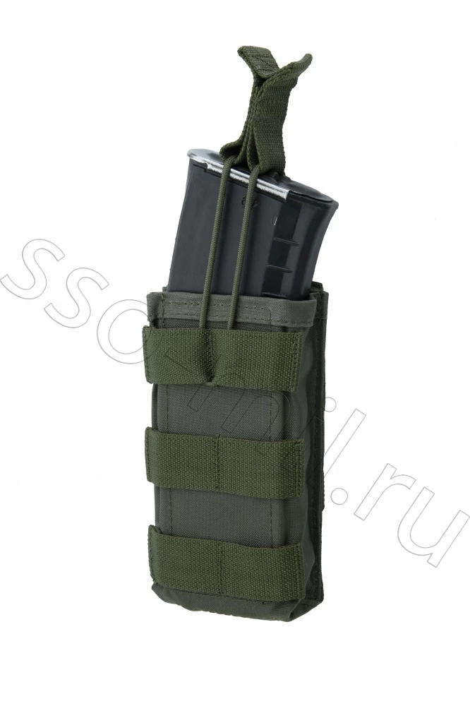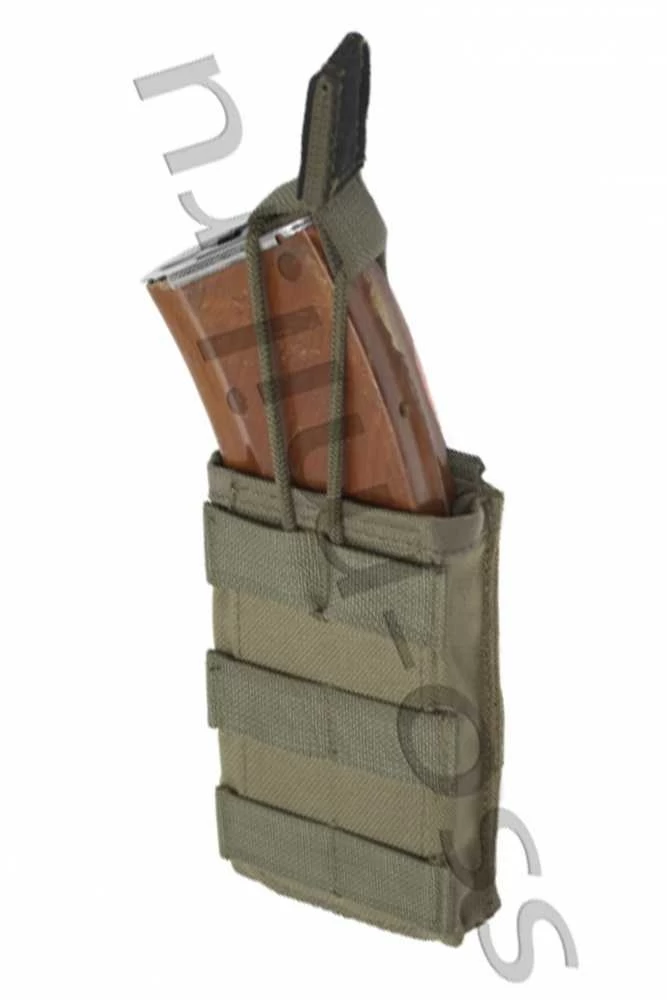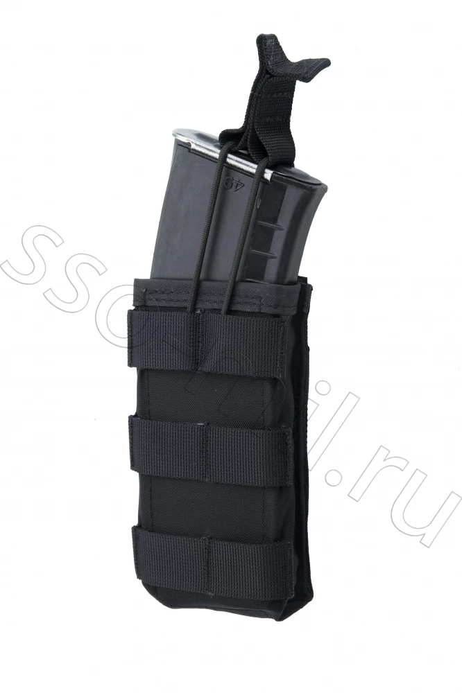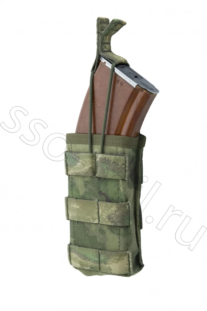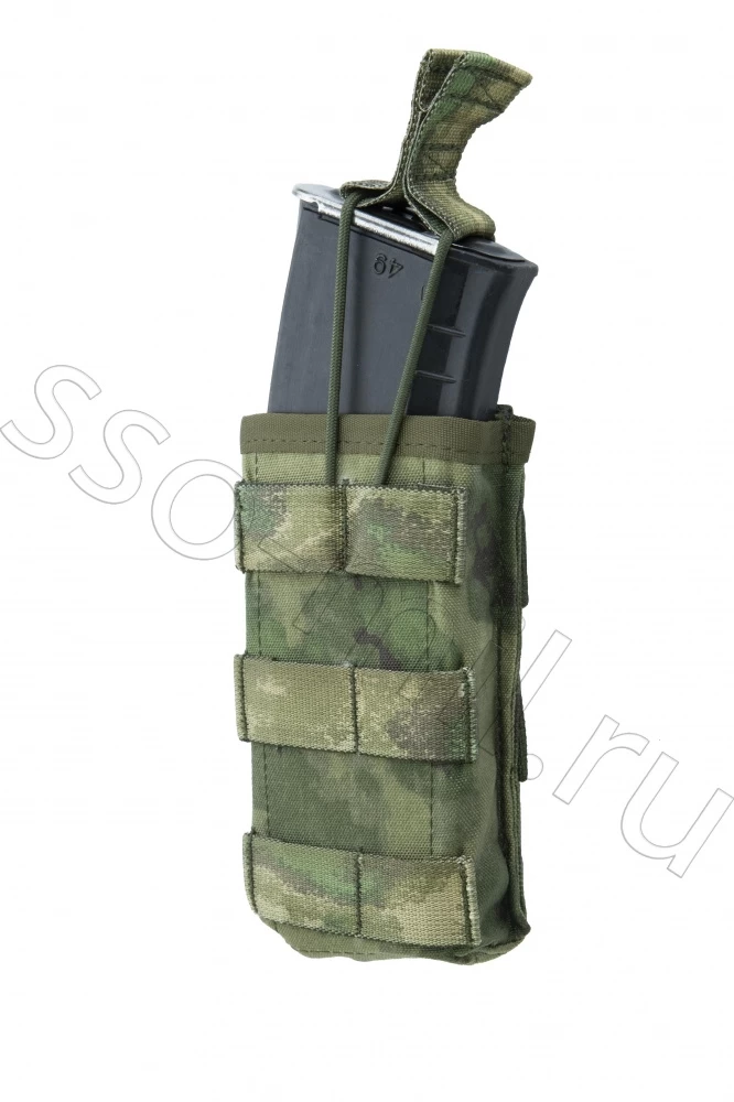 АКМ 1 MOLLE без клапана. Сумка для 1 магазина АК- Сумка предназначена для размещения одного магазина от АК и максимально быстрого доступа к нему. В сумку помещается магазин 7,62 от автомата АКМ или 5,45 от АК-74М.- Фиксация магазина происходит с помощью эластичного шнура с флажком, которым удобно пользоваться даже в перчатках.- Для того чтобы сумка лучше держала форму и ей было удобнее пользоваться в переднюю стенку вшит лист пластика толщиной 1 мм.- Для размещения на сумке дополнительного снаряжения или других сумок, на передней стороне нашиты ременные ленты с 6ю ячейками MOLLE.- На дне расположено отверстие с люверсом для слива воды.- На снаряжении сумка занимает 2 стандартные ячейки MOLLE.- При необходимости подсумок можно устанавливать не только на MOLLE основу, но и на ремни, сделав из строп петли нужного размера.- Высота 14,5 см, ширина 8 см, глубина 3 см.- Вес пустого подсумка из ткани плотностью 500D – 90 г.