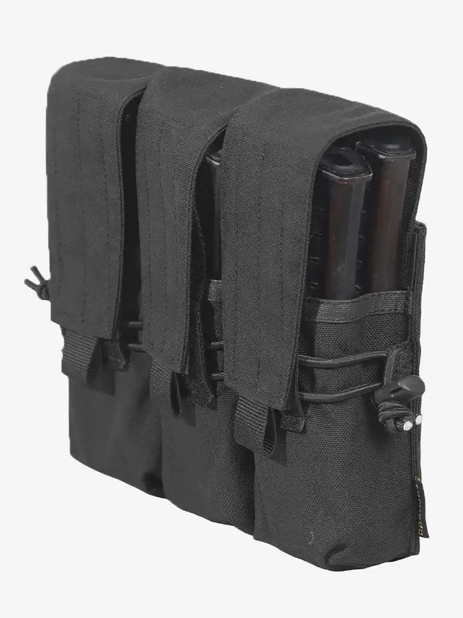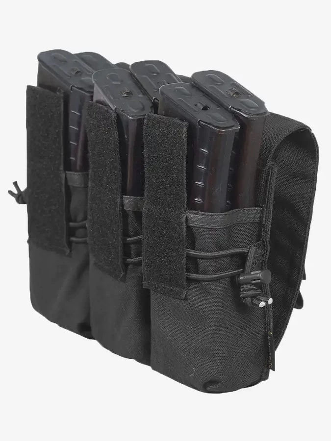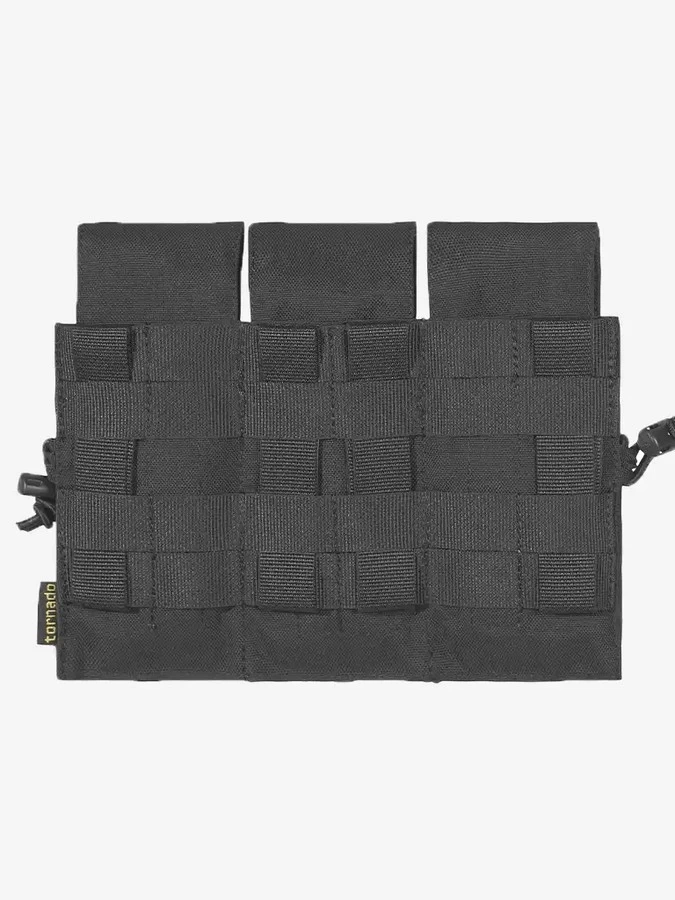 Подсумок тройной под 6 автоматных магазинов Tornado Tactical (Россия) закрытого типа, универсальный. Изготовлен из высокопрочного нейлона с полиуретановой пропиткой. - 3 отдельные секции, по 2 магазина каждая - Подходит для магазинов АК, АС ВАЛ, М4, AR15 - Клапан имеет универсальную длину и закрывается на застежку-липучку велкро. У подсумков на боковой стенке есть эластичный шнур который регулирует объем подсумка по ширине и дополнительно фиксирует магазины, защищая от утери. На задней стенке подсумка вшитые стропы системы крепления MOLLE, которые позволяют разместить подсумок на любом тактическом снаряжении.