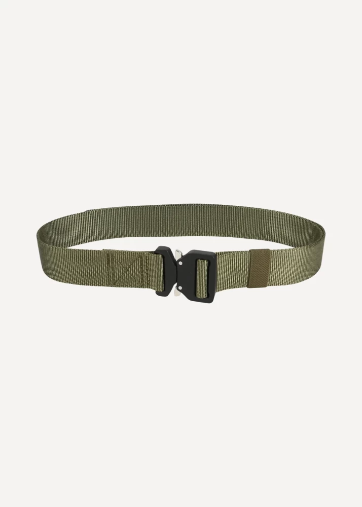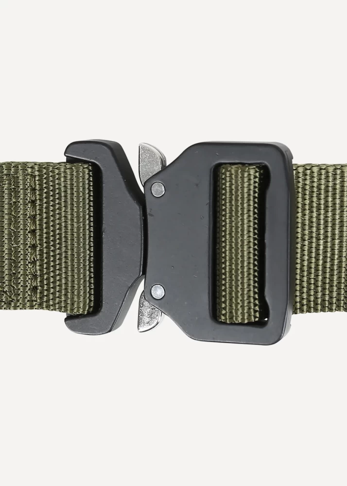 Простой брючный ремень с металлической пряжкой «COBRA» Особенности Жесткая ременная стропа в один слой, поддерживает форму, не перекручивается Металлическая пряжка (сплав цинка и алюминия) «COBRA», с удобным расстегиванием боковыми клавишами как у фастекса. Обладает высокой надежностью и прочностью Встречная часть пряжки пришита крестообразным швом Ответная часть пряжки с регулировкой Конец ремня срезан под углом и оплавлен для легкого продевания в пряжку Шлевка из резинки для фиксации лишнего конца ремня Ремень выпускается в трех размерах в зависимости от максимального обхвата: 120 см, 130 см, 140 см. Допускается укорачивание ремня только при использовании термоножа или паяльника Характеристики Материал: 70% нейлон, 30% полиэстер Материал пряжки: цинковый сплав Ширина ремня: 38 мм Ширина пряжки: 50 мм