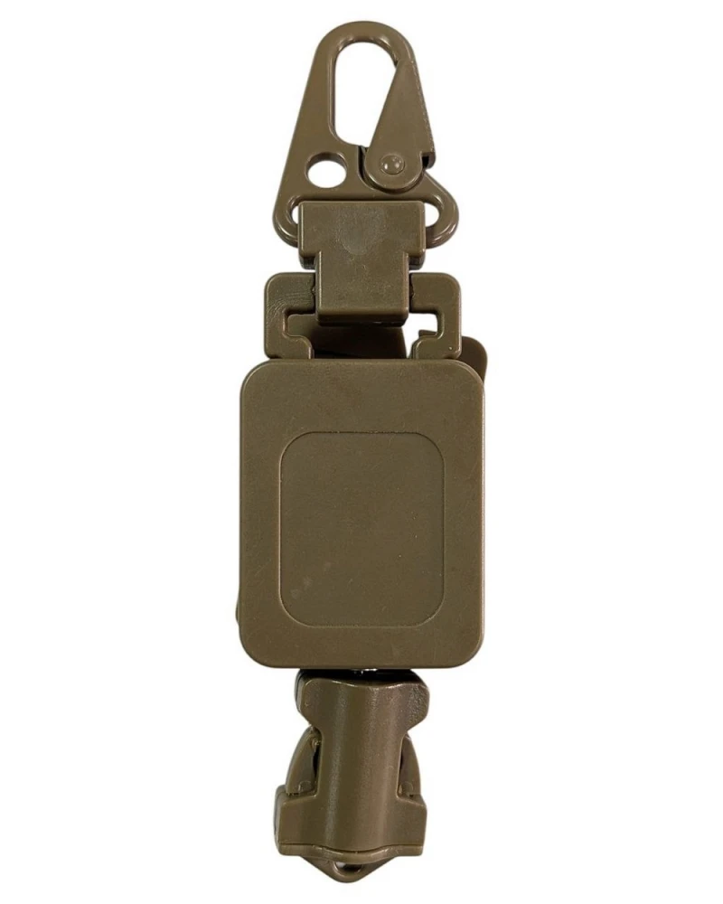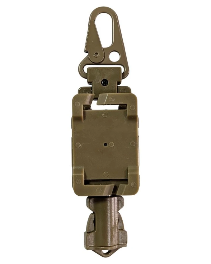 Ретрактор для тактических ножниц и снаряжения. Назначение:Ретрактор предназначен для предотвращения утери предметов и для их быстрого возвращения на место. Он представляет из себя специальный механизм с вытяжным тросиком, на котором есть крепление для разных видов предметов. Тросик автоматически втягивается после вытяжения, возвращаясь на место. Благодаря этому, подвешенный инструмент (например, ножницы) всегда будут висеть там, где вы их закрепили, вне зависимости от того, сколько раз за день вы ими воспользовались. Вес: ~150 грамм за комплект со всеми видами креплений и в транспортной упаковкеВес самого ретрактора: ~80-90 гМатериал: ABS пластикЦвет: коричневый песочный