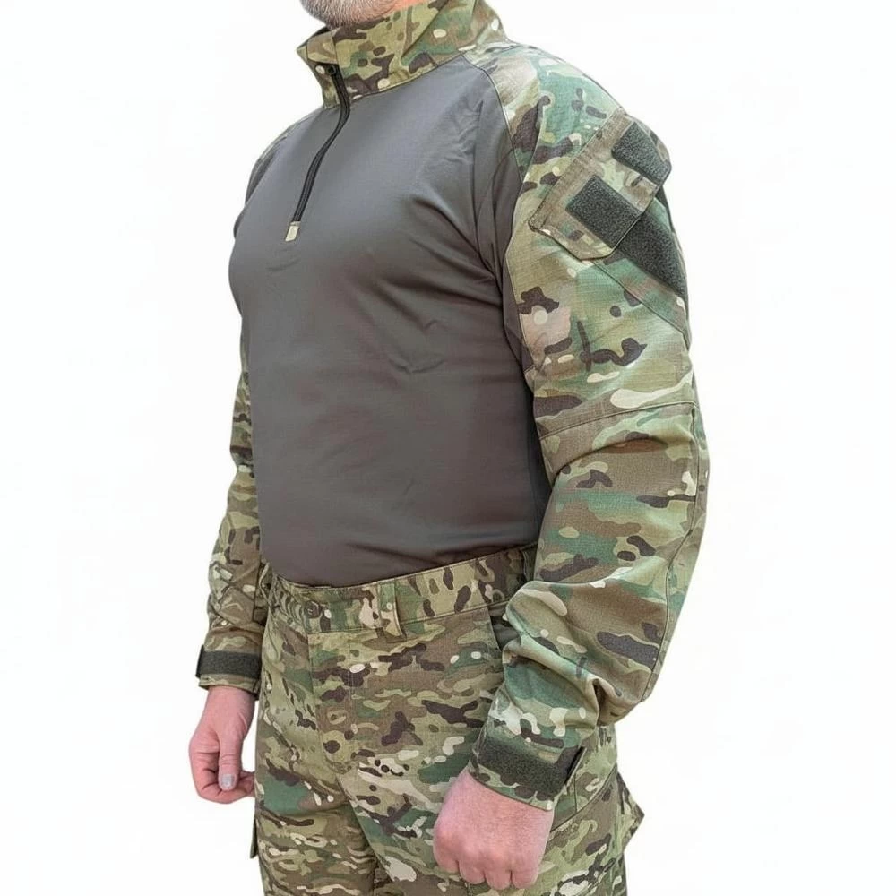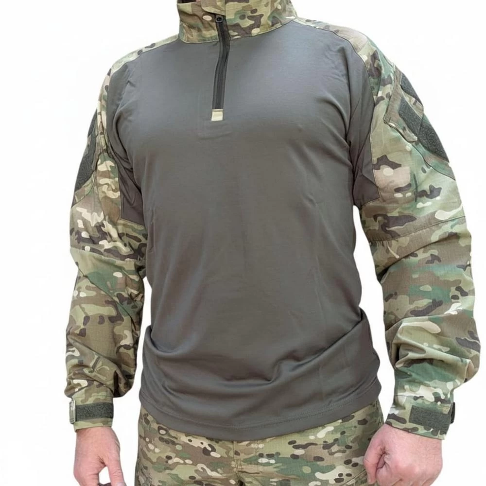 Боевая рубаха от компании Tornado Tactical (Россия). Рукава рубахи выполнены из плотной смесовой ткани, торс – из мягкого, эластичного трикотажа. Ворот застегивается на молнию, сам ворот можно поднять вверх для защиты шеи от натирания снаряжением.Объем манжетов рукавов регулируется липучкой. На плечах есть накладные карманы, а в зоне локтей идет тканевая накладка, образующая отсек на липучке, куда при желании можно установить мягкую защиту локтя (защита в комплект не входит).Торс рубахи сшит из трикотажа (52% пенье, 40% нейлон, 8% эластан). Рукава – из прочного, плотной смесовой ткани (65% полиэстер, 35% хлопок).