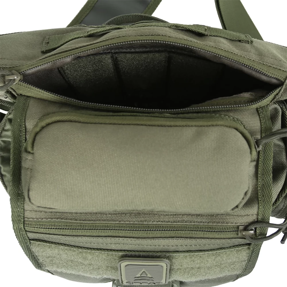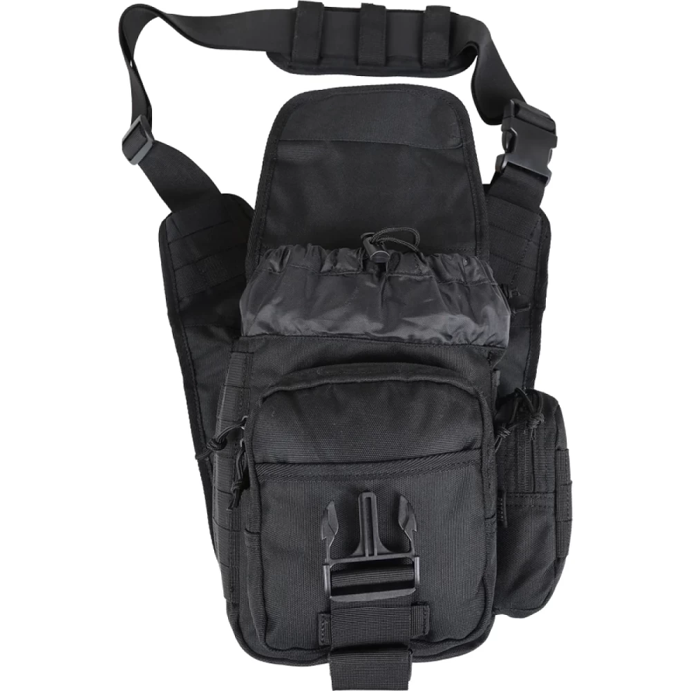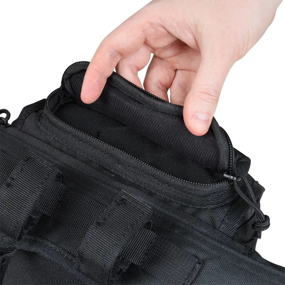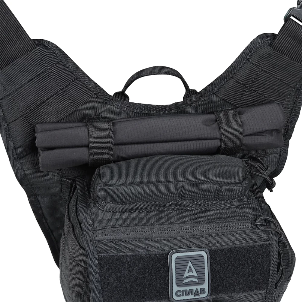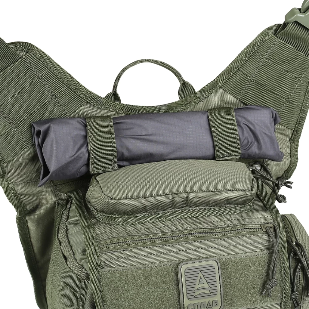 Тактическая городская сумка компоновки типа «Versipack» с возможностью крепления кобуры для скрытого ношения оружия Симметричная ориентация основного отделения относительно лямок Вход в основное отделение оснащен тубусом (утяжка шнуром с фиксатором) и закрывается сверху клапаном на регулируемом 50 мм фастексе. Вшитая застежка на липучке для фиксации свободного конца стропы в свернутом состоянии На клапане спереди липучка-петля большой площади для размещения шевронов и именных лент. Съемный логотип на липучке в комплекте. Спереди клапана плоский карман на горизонтальной молнии Сверху клапана объемный карман на молнии для очков, с усилением стенок толстой полужесткой пеной и подкладкой из мягкого велюра Спереди основного отделения объемный карман на молнии с внутренней организацией (кармашки и крючок-карабин для подвеса мелочей) и внешний плоский карман с открытым верхом. Эти карманы накрываются клапаном основного отделения Левая боковая поверхность основного отделения со стропами PALS во всю высоту для навески подсумков Правая боковая поверхность основного отделения с объемным карманом на молнии, передняя стенка кармана с усилением полужесткой пеной и нашитыми стропами PALS Внутри основного отделения два кармана, передний плоский и задний объемный из сетки с подрезиненным верхом В основании сумки большой плоский отсек с доступом сверху на горизонтальной молнии. На задней стенке внутри отсека нашита липучка-петля большой площади для крепления внутренней организации или кобуры для скрытого ношения оружия Над отсеком для кобуры расположено крепление зонта в виде горизонтальной стропы с ячейками, в которые продеты две съемных регулируемых шлевки из стропы на липучках. Эти шлевки удерживают зонт в горизонтальном положении Сверху ручка из стропы для переноски Плечевой ремень из регулируемой 50 мм стропы, на фастексе. В комплекте широкая мягкая съемная плечевая подушка с тремя шлевками на липучках, под которые пропускается плечевой ремень, с нескользящей подкладкой Сверху сумки в двух местах крепления плечевого ремня вшита полужесткая пена для поддержания формы, снаружи располагаются стропы PALS для крепления небольших подсумков и скрытые карманы с открытым верхом для переноски ножей и мультитулов с клипсой (функционал показан на фото) В комплекте съемный регулируемый 25 мм ремень на двух крючках-карабинах, крепящийся к полукольцам на задней стороне сумки. Он предназначен для фиксации относительно талии, что позволяет избежать колебаний сумки при активном движении На всех молниях замки с удобными ухватками из шнура Характеристики Вес: 640 г Размеры основного отделения до основания тубуса (ШxТxВ): 20×10×21 см Размеры бокового кармана (ШxТxВ): 10x4x15 см Размеры фронтального кармана (ШxТxВ): 15x5x17 см Основная ткань: Polyester 900D PU Пластиковая фурнитура: Duraflex®