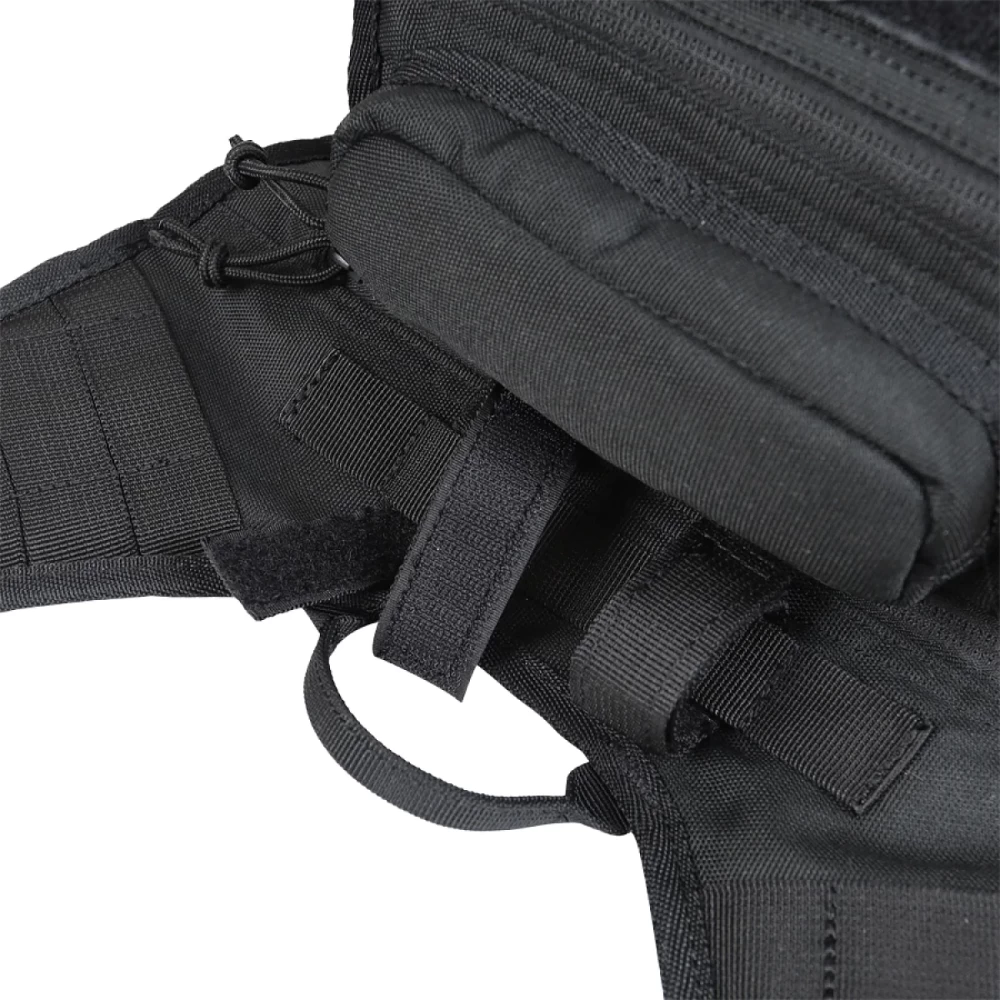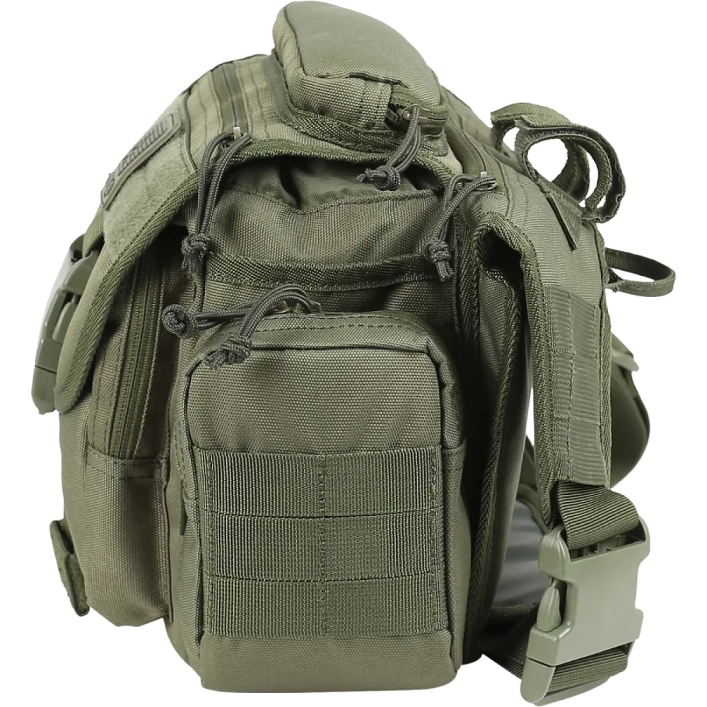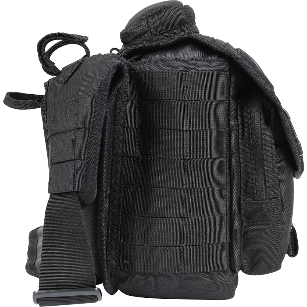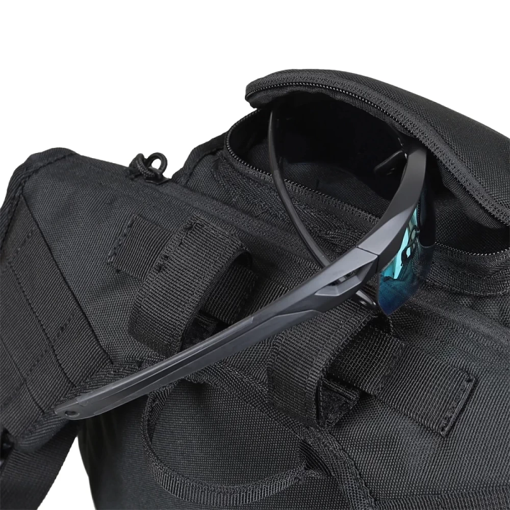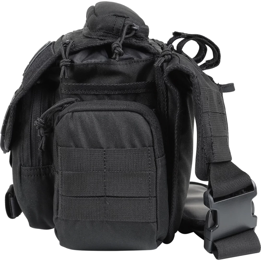 Тактическая городская сумка компоновки типа «Versipack» с возможностью крепления кобуры для скрытого ношения оружия Симметричная ориентация основного отделения относительно лямок Вход в основное отделение оснащен тубусом (утяжка шнуром с фиксатором) и закрывается сверху клапаном на регулируемом 50 мм фастексе. Вшитая застежка на липучке для фиксации свободного конца стропы в свернутом состоянии На клапане спереди липучка-петля большой площади для размещения шевронов и именных лент. Съемный логотип на липучке в комплекте. Спереди клапана плоский карман на горизонтальной молнии Сверху клапана объемный карман на молнии для очков, с усилением стенок толстой полужесткой пеной и подкладкой из мягкого велюра Спереди основного отделения объемный карман на молнии с внутренней организацией (кармашки и крючок-карабин для подвеса мелочей) и внешний плоский карман с открытым верхом. Эти карманы накрываются клапаном основного отделения Левая боковая поверхность основного отделения со стропами PALS во всю высоту для навески подсумков Правая боковая поверхность основного отделения с объемным карманом на молнии, передняя стенка кармана с усилением полужесткой пеной и нашитыми стропами PALS Внутри основного отделения два кармана, передний плоский и задний объемный из сетки с подрезиненным верхом В основании сумки большой плоский отсек с доступом сверху на горизонтальной молнии. На задней стенке внутри отсека нашита липучка-петля большой площади для крепления внутренней организации или кобуры для скрытого ношения оружия Над отсеком для кобуры расположено крепление зонта в виде горизонтальной стропы с ячейками, в которые продеты две съемных регулируемых шлевки из стропы на липучках. Эти шлевки удерживают зонт в горизонтальном положении Сверху ручка из стропы для переноски Плечевой ремень из регулируемой 50 мм стропы, на фастексе. В комплекте широкая мягкая съемная плечевая подушка с тремя шлевками на липучках, под которые пропускается плечевой ремень, с нескользящей подкладкой Сверху сумки в двух местах крепления плечевого ремня вшита полужесткая пена для поддержания формы, снаружи располагаются стропы PALS для крепления небольших подсумков и скрытые карманы с открытым верхом для переноски ножей и мультитулов с клипсой (функционал показан на фото) В комплекте съемный регулируемый 25 мм ремень на двух крючках-карабинах, крепящийся к полукольцам на задней стороне сумки. Он предназначен для фиксации относительно талии, что позволяет избежать колебаний сумки при активном движении На всех молниях замки с удобными ухватками из шнура Характеристики Вес: 640 г Размеры основного отделения до основания тубуса (ШxТxВ): 20×10×21 см Размеры бокового кармана (ШxТxВ): 10x4x15 см Размеры фронтального кармана (ШxТxВ): 15x5x17 см Основная ткань: Polyester 900D PU Пластиковая фурнитура: Duraflex®